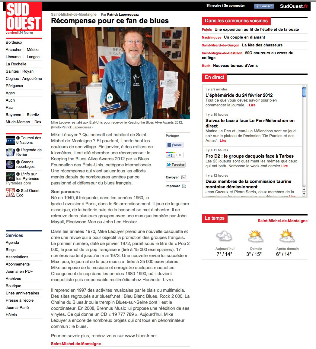 Mike Lecuyer is one of the most important names in French blues. Though he began his love of the blues as a musician, it was his internet creation of La Chaine du Blues (the chain of blues) in 1999 that became his blues calling. This website connects the people of France with the totality of the country’s blues scene. The website, www.bluesfr.net, contains detailed information about clubs and festivals throughout France. It also features a comprehensive listing of French blues websites, web sites from other French-speaking countries, e.g., Belgium, Canada, Switzerland, etc., e-interviews, video, guitar instruction and blues news archives. For 12 years, he has coordinated the Tremplin Blues sur Seine (Challenge). He is the co-founder of W3 Bluesradio, the only French blues web radio playing continuous blues. He is also one of the 14 co-founders of France Blues, the new French association dedicated to promoting blues in France.